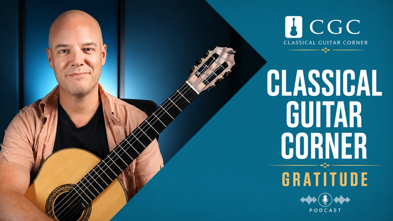 The episode closes with a reflection on gratitude — prompted by returning to the guitar after a week of illness. Simon’s point is simple and real: if you’re well enough to pick up the guitar and make sound, that’s worth pausing to appreciate. The inner critic is always nearby in classical guitar, but gratitude can quietly displace it.